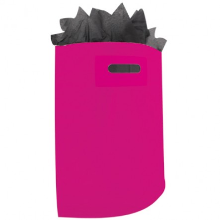 De draagtassen zonder bodembouw hebben GEEN versterkte handgreep Deze plastic tassen zijn gemaakt van 50 micron LDPE poly, wat zorgt voor een glanzende uitstraling. Het materiaal is fuchsia gekleurd.