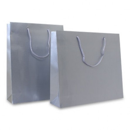 Deze luxe papieren tassen zijn gemaakt van 170 grs. wit papier. De buitenzijde is glans gelamineerd met een croco embossing, wat ervoor zorgt dat deze tassen een glossy uitstraling hebben.Om de tassen extra stevigheid te geven, worden deze uitgevoerd met een verstevigde omslag met daarin 2 ingeknoopte zwarte katoenen koorden van 50 cm. De tas is voorzien van bodemkarton. De buitenkant van de tassen zijn allover zilver gedrukt.