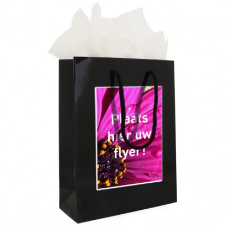 Deze papieren venstertassen zijn gemaakt van 170 grams wit papier. De buitenzijde is voorzien van een glans laminaat, waardoor deze tassen een luxe uitstraling hebben.Deze tassen zijn aan de buitenzijde all-over zwart bedrukt.