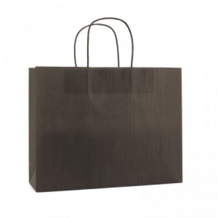draagtassen in kraft Deze papieren tassen zijn gemaakt van 120 grs. wit gestreept kraft. Het materiaal is onbewerkt waardoor deze tassen een stoere en ecologische uitstraling hebben.Het materiaal van deze papieren tassen is voorzien van verticale strepen wat zorgt voor een luxe uitstraling. De buitenzijde van de tassen is all-over zwart bedrukt. De binnenzijde van de tas is wit.