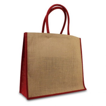 De jute draagtassen zijn voorzien van ronde katoenen draaglussen. De zijvouwen en bodem zijn bordeauxrood van kleur.