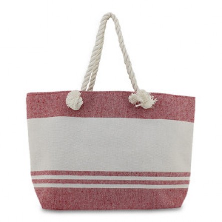 De buitenzijde van de vintage bags zijn gemaakt van een combinatie van jute en katoen. De binnenzijde is gevoerd met zwart gekleurd nylon.Deze draagtassen zijn voorzien van 2 dikke katoenen sailor koorden en 4 zilveren eyelets. Aan de binnenkant van de tas is een opbergzakje met rits aanwezig. De tas is voorzien van rode horizontale strepen die de tassen een vrolijke zomerse uitstraling geven.