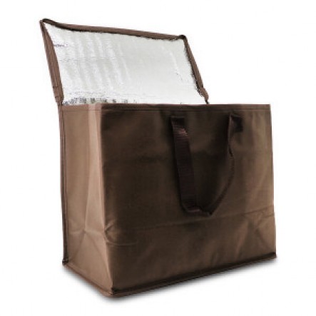 De non-woven koeltassen zijn gemaakt van 100 grs. non-woven en zijn voorzien van een gealuminiseerde binnenzijde. De buitenzijde van de koeltassen is bruin.De non-woven koeltassen zijn voorzien van 2 korte nylon webbing lussen die aan de buitenzijde van de tas gestikt zijn. De lussen matchen met de kleur van de tas.