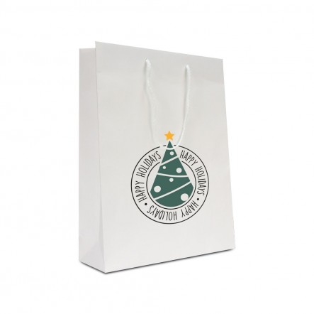 Dit model is gemaakt van wit papier. Deze luxe papieren tassen zijn voorzien van 2 ingeknoopte korte katoenen koorden. Het katoen draagt prettig in de hand. De papierdikte is 170 grams papier. Deze luxe tassen zijn ontzettend populair en zeer breed inzetbaar. Leuk om tijdens de feestdagen te gebruiken in uw winkel. Daarnaast ook een populaire tas als geschenkverpakking. Luxe papieren kersttassen - Happy Holidays zijn enkelzijdig bedrukt en vanuit voorraad in verschillende formaten te bestellen. Deze luxe papieren tassen zijn door hun sterke kwaliteit vaak te hergebruiken en om deze reden duurzaam te noemen.* u ziet pas prijzen als u bent ingelogd